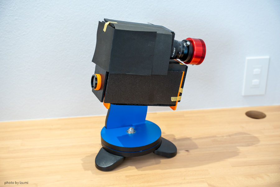 筐体は、この前までルアーを作っていたオレンジのABSで作りましたがこれは大失敗。太陽の光が透けて入ってきたので、黒スチレンボードと黒画用紙でカバーしました。