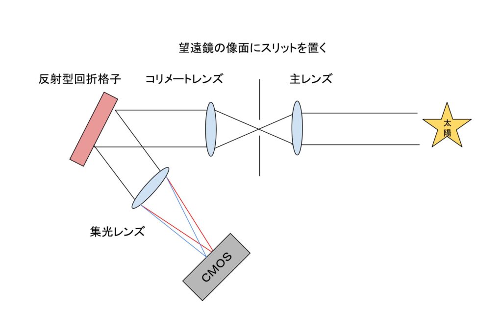 主レンズを使って、スリット面に太陽の像を写します。太陽の像の内、1ラインをスリットによって取り出し、これをコリメートレンズで平行光にします。平行光になった光は反射型回折格子にあたり、波長ごとに違う方向に飛びます。これを集光レンズで、CMOSセンサに結像させます。波長ごとに異なる方向に光が分けられているので、波長ごとにCMOSセンサ上の違う位置に結像します。CMOSセンサ上には波長ごとのラインが並ぶことになります。