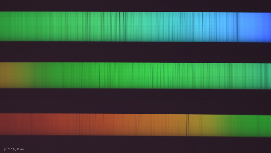 回折格子の角度を変えながら3回写真を撮り、下の写真のように1枚に並べてみました。下段の緑からオレンジに差し掛かったところにある2本の黒い線が、有名なD線でしょうか。Ca吸収線2本(589.6 nm, 589.0nm)がはっきり見えています。
